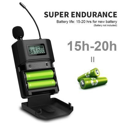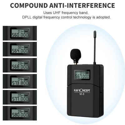 - Uses UHF frequency band and complex interference-free circuit, and 6 preset channels are available; With strong anti-interference capability, more than 4 sets of devices can be used simultaneously without mutual interference.