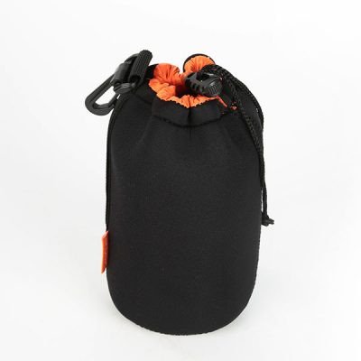 The pouch has a drawstring closure that allows you to easily access your lens while keeping it securely in the pouch. It also has a carabiner clip that allows you to attach the pouch to your camera bag or belt loop for easy carrying.