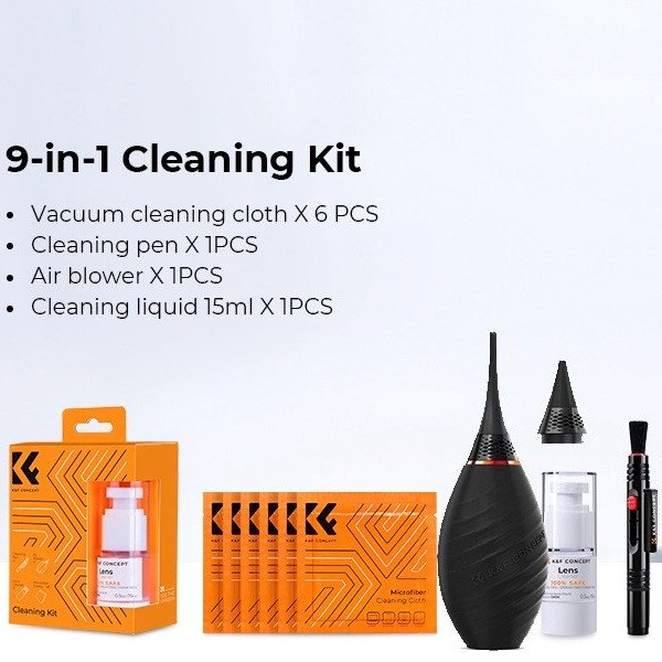 The tip is safe for use on coated lenses and will not scratch or damage the surface.Microfiber cleaning cloth, which is perfect for wiping down equipment after cleaning. Overall, the K&F Concept SKU.2147 9 in 1 Professional Cleaning Kit is a comprehensive and effective cleaning solution for photographers and videographers. The four essential cleaning tools including the lens cleaning pen, microfiber cleaning cloth, blower and cleaning liquid make it easy to maintain your equipment and ensure that it is always clean and ready for use.