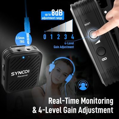 The Synco WAir-G1-A1 is an ultracompact, single-channel digital wireless microphone system great for shooting videos for Instagram, YouTube, and TikTok. It offers a complete, versatile, and simple-to-use solution for recording dialogue, interviews, and speech directly to a mirrorless/DSLR camera or a mobile device with a 3.5mm input.