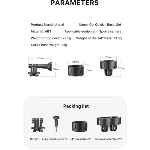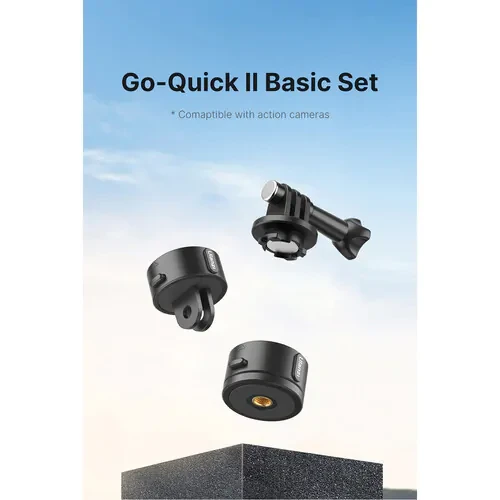 Ulanzi Go-Quick II Basic Magnetic Mount Set and its various components to your action camera tripods or mounts for quick release compatibility. Included in the set is a 3-prong camera mount compatible with various action camera models from DJI, Insta360, and GoPro which then inserts into either of the two bases. One of the bases is equipped with a 1/4"-20 thread while the other two have 2-prong mounts for compatibility with various tripods or selfie sticks. Both a magnetic connection and a quick release button keep your camera secure inside your base of choice.