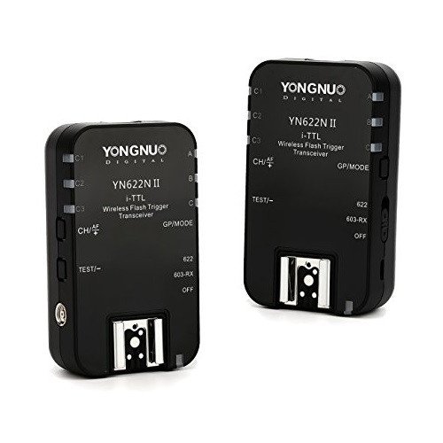 The Yongnuo i-TTL Transceiver YN622N II for Nikon Cameras 2-Pack is comprised of two 7-channel transceivers that work on the 2.4GHz frequency. The units have 3 working modes, I-TTL (II), Manual, and Multi, and have a 300′ wireless range. The triggers supports FEC, FEB, FEL, 1st and 2nd Curtain Sync, Modeling flash, i-TTL II Group Ratio (ALL/A:B/A:B C), Manual/Multi group (ALL/ A:B/ A:B:C), Manual and Multi mode, Auto Zooming, Manual Zooming, and AF Lamp. The YN622N II transceivers will also support HSS (High-Speed Sync) for action freezing and greater exposure latitude. (Please see below for compatible cameras and flashes)