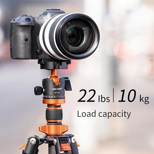 This Magnesium Alloy Travel Tripod with Rotating Lateral Multi-Angle Center Column from K&F Concept is a lightweight magnesium-alloy tripod that includes an Arca-type compatible ball head. It has a maximum height of 77.2″ and can support up to 22 lb. It folds down to 19.7″ and weights only 3.1 lb for easy transport or storage.