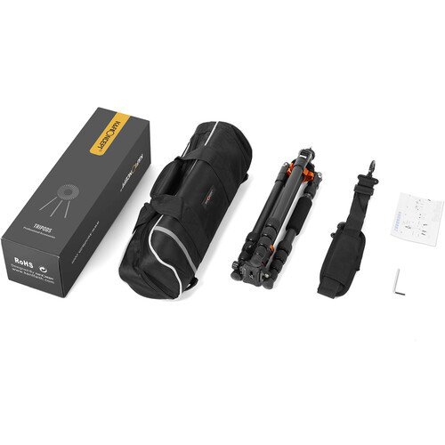 The K&F Concept KF09.094 SA225C1 D225C2 Carbon Fiber Tripod with Arca-Type Ball Head from K&F Concept is a lightweight and versatile tripod for both studio and travel. It has a load capacity of up to 17.6 pounds, so it is suitable for use with compact, mirrorless, and DSLR cameras with large lenses. It has a maximum height of 56", but thanks to its reverse-folding leg design, it collapses to a mere 15.7" length, making it easy to store or carry almost anywhere. The legs offer independent spread and three locking angles and can also be reversed for inverted shooting for a low to the ground perspective. In addition, one leg can be unscrewed to convert into a 59.8"-tall monopod for situations where a full tripod may be too bulky or slow, like when shooting wildlife or sports. The monopod leg features a padded collar for improved grip. The center column has a rapid locking collar for quick adjustment and features a spring-loaded ballast hook for added stability.