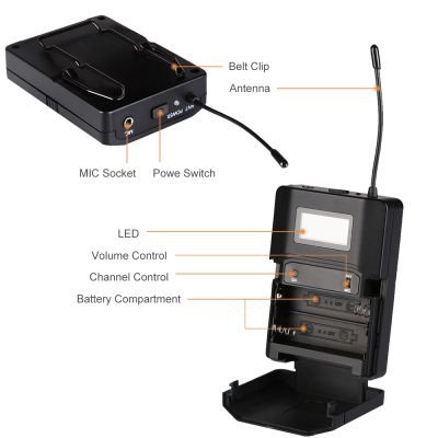 - Uses UHF frequency band and complex interference-free circuit, and 6 preset channels are available; With strong anti-interference capability, more than 4 sets of devices can be used simultaneously without mutual interference.