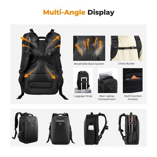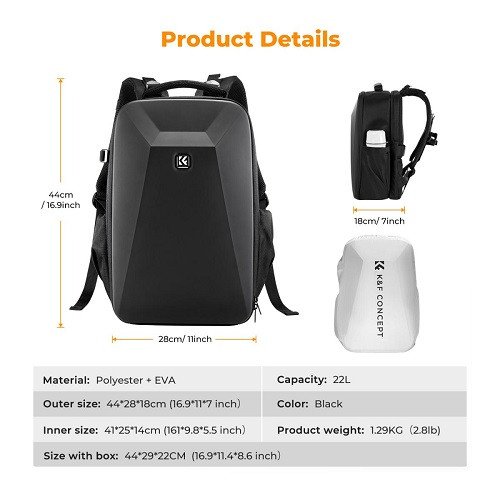 The K&F Concept KF13.134 Hardshell Camera Backpack is designed to provide photographers and videographers with a durable, protective and functional solution for carrying their equipment. This backpack combines rugged construction with thoughtful design features to ensure that your gear is safe and easily accessible. The backpack likely has a hard outer shell made of high-impact plastic or ABS material. This rigid exterior safeguards your camera equipment from bumps, scratches and accidental impacts, providing peace of mind while you're on the go.