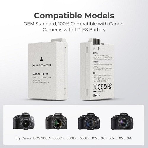 The K&F Concept LP-E8 Two Batteries & Fast Dual Slot Charger Set is designed to provide photographers with a reliable power solution for their Canon cameras. This set includes two high-capacity batteries and a dual-slot charger ensuring that you have enough power for extended shooting sessions.