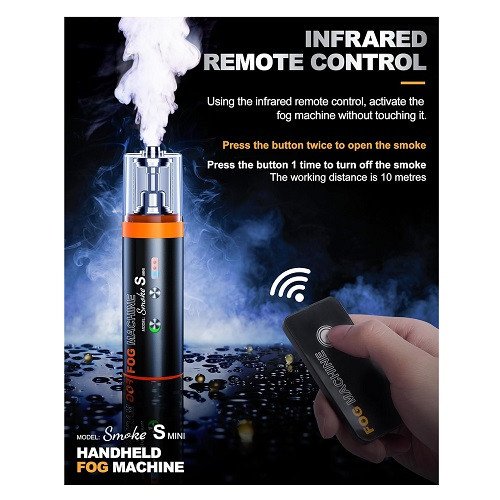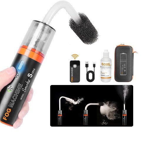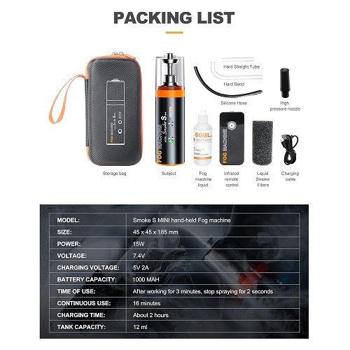 The Smoke S features an internal lithium-ion battery that can provide up to 16 minutes of continuous smoke and can cover an area of 20 cubic meters in a single minute. Includes 60ml one bottles of smoke fluid a remote control a silicone hose a hard elbow a hard straight tube a high-pressure nozzle and a liquid smoke filter. Also included are a USB-C charging cable and a carrying case.