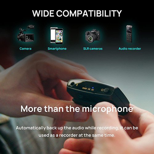 Designed for mobile journalists, videographers, and vloggers, the WE10 Pro Dual Transmitter Wireless Microphone System from MOZA is a true wireless audio system with backup recording capability. This configuration offers two mic/transmitters and a compact dual-channel receiver, making it well suited for recording dialogue, interviews, and speech with two on-camera personalities directly to a mirrorless/DSLR camera, a camcorder, or a mobile device.